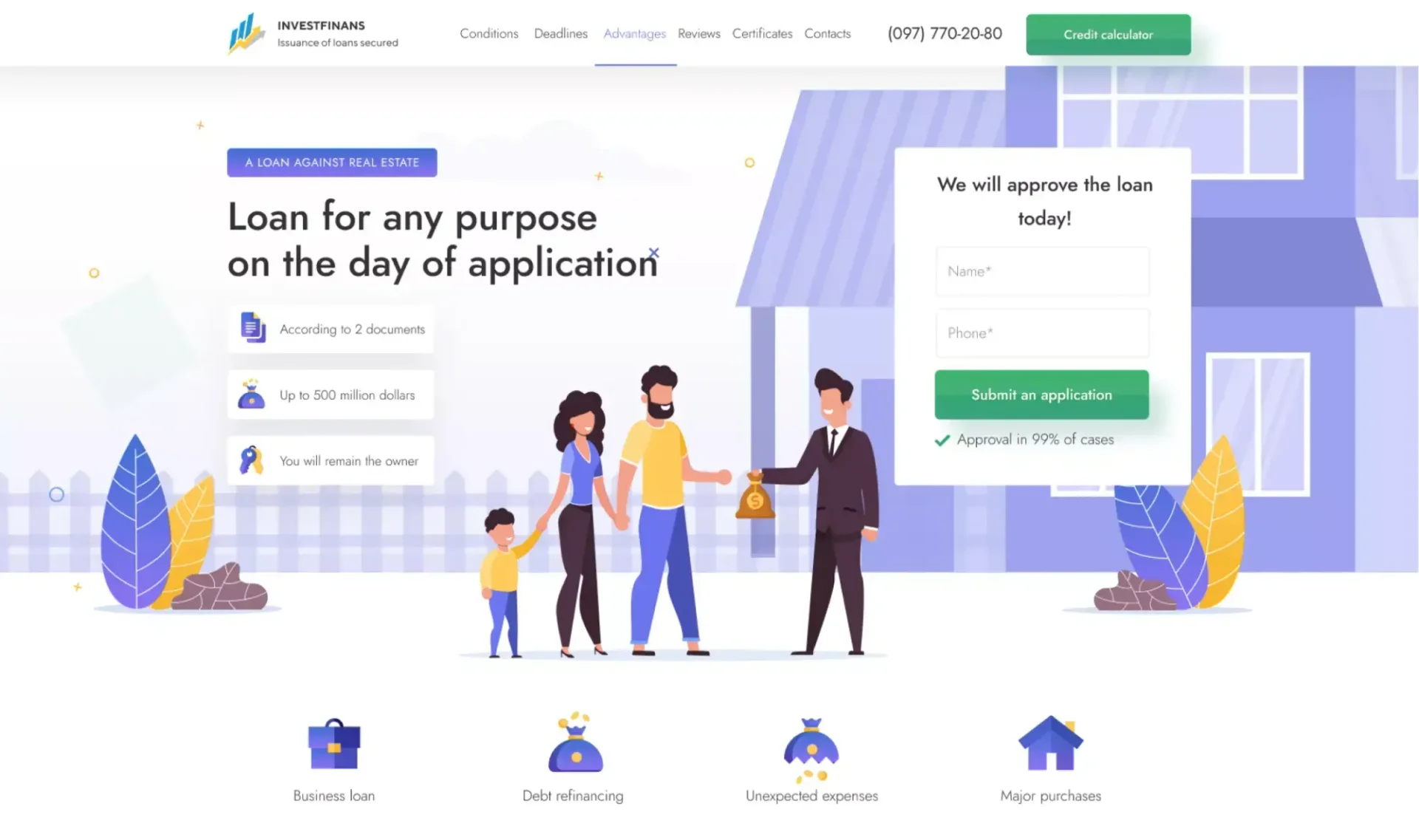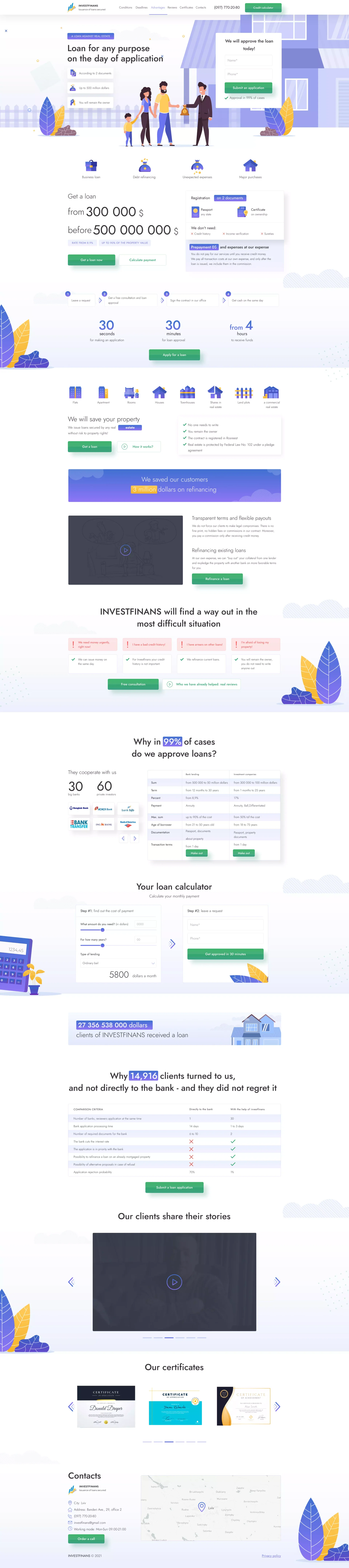 The home page of the financial institution's website is designed for convenient and fast interaction with customers. The design combines functionality, informativeness and modern style, which helps users easily navigate the company's services. The page presents key information about loans, their terms and benefits, which allows customers to quickly assess their capabilities.