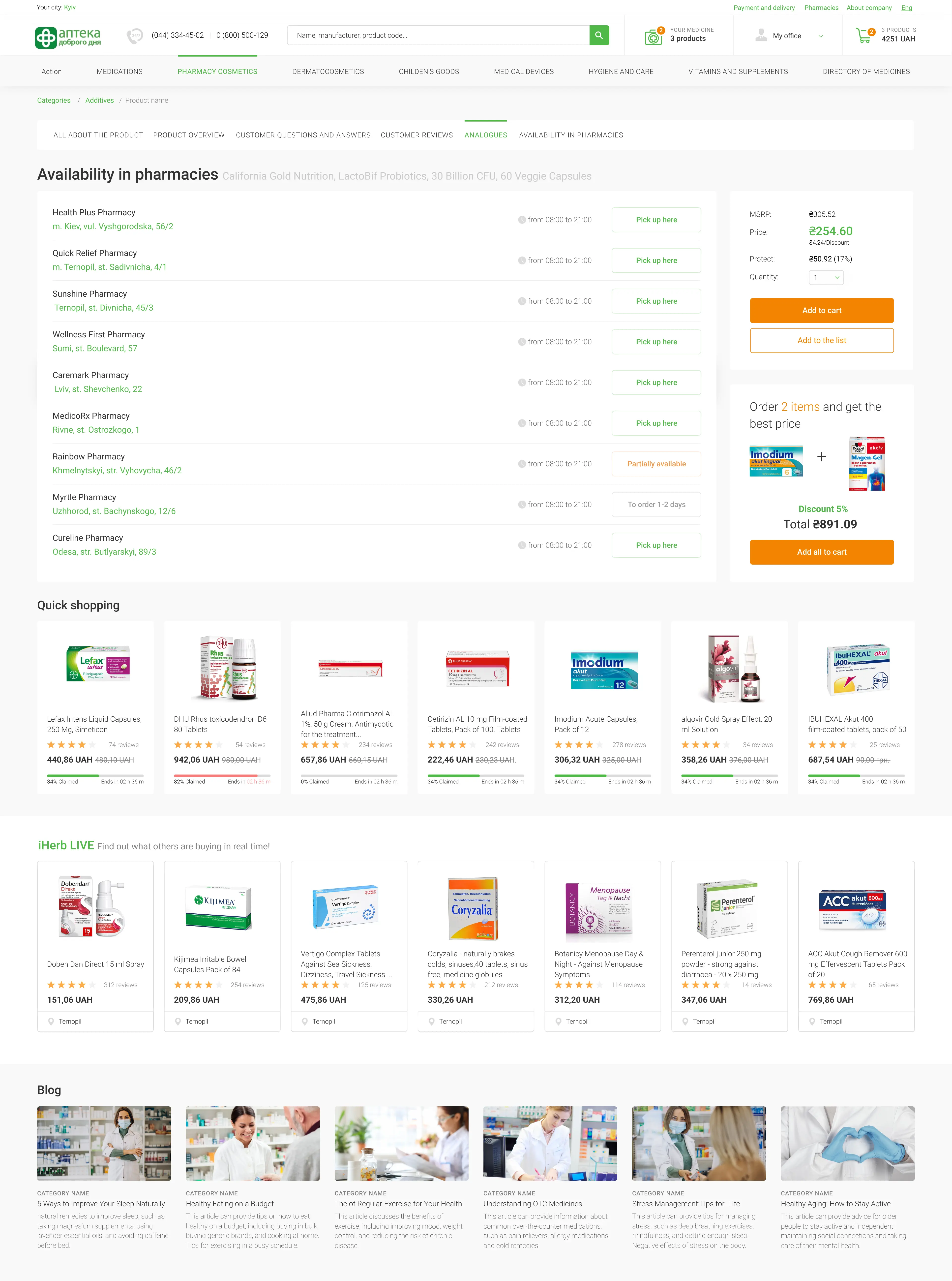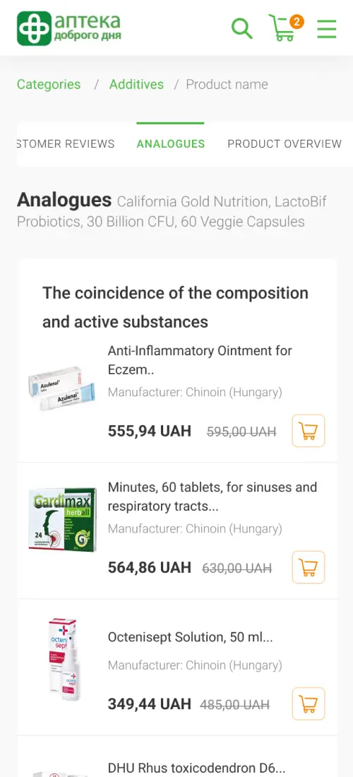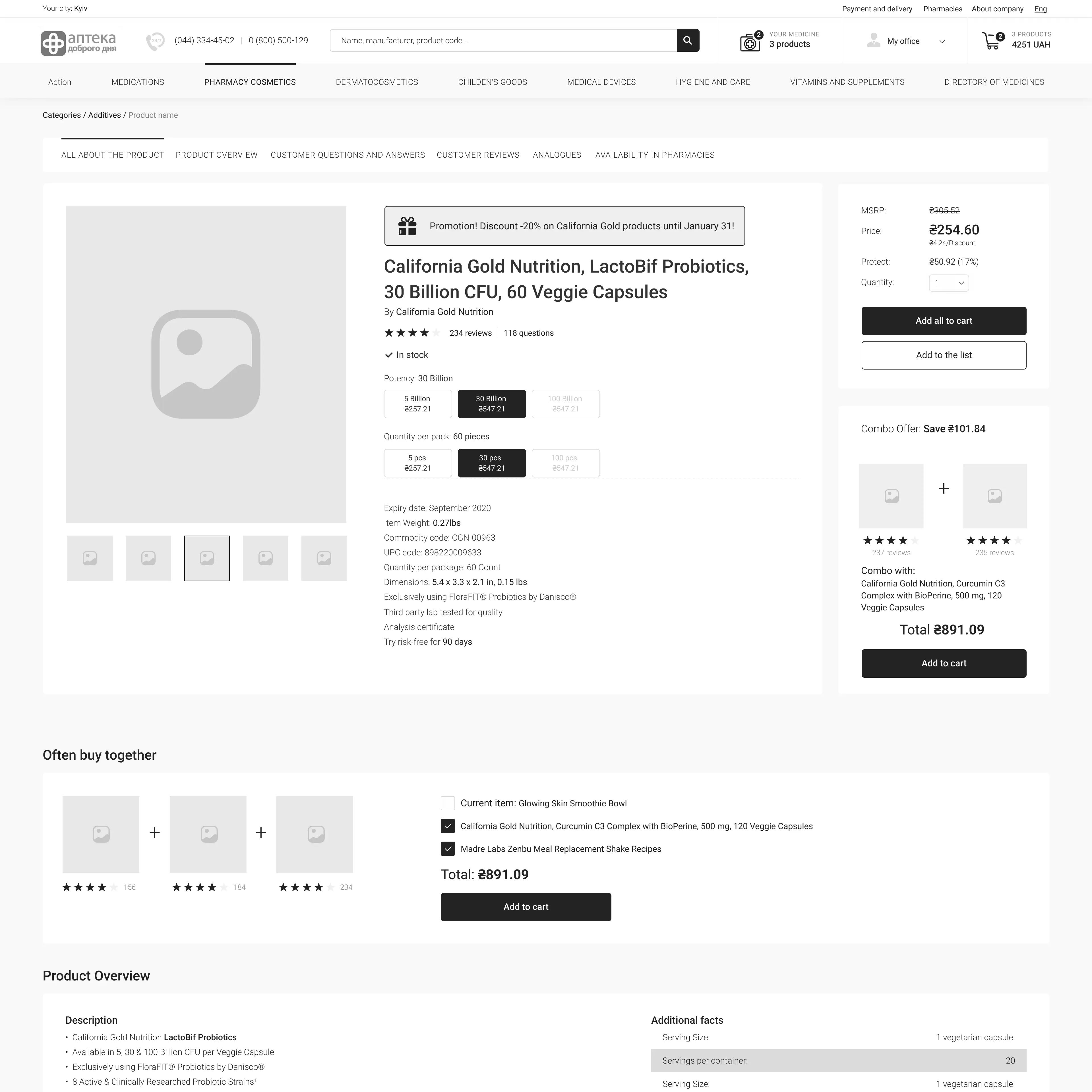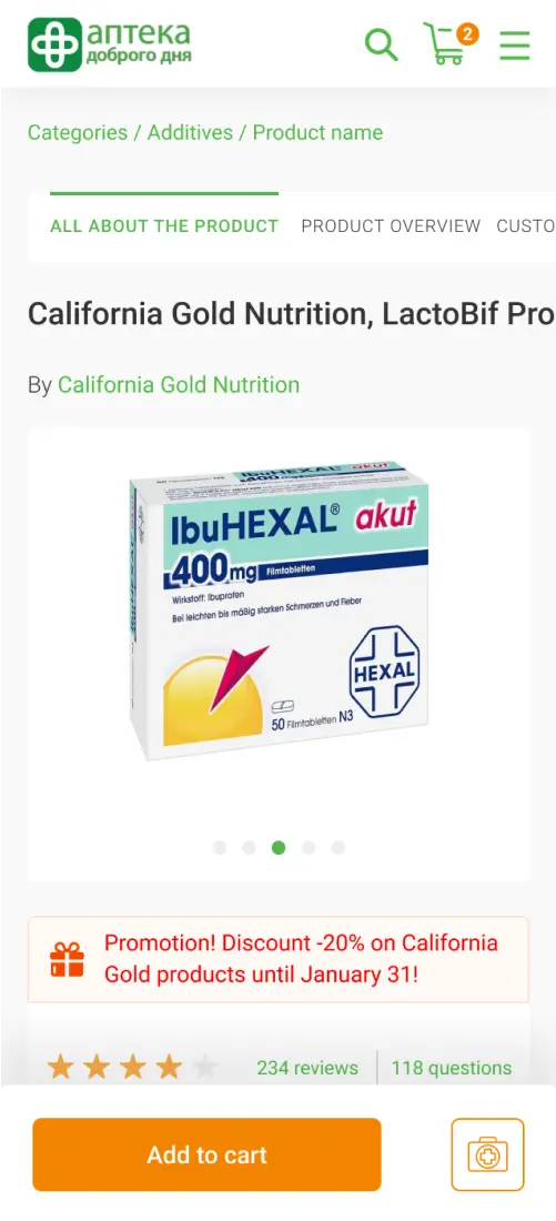 The product card provides detailed information about a specific item. It includes the product name, photos, description, usage instructions, ingredients, manufacturer, price, and other specifications. Through a slider, all this information can be conveniently viewed on a single page, ensuring even more convenient and quick access to all necessary product details.