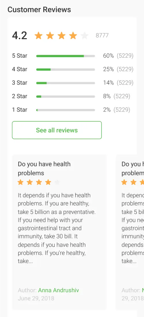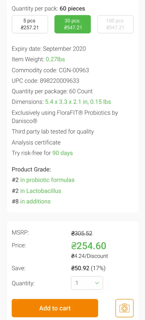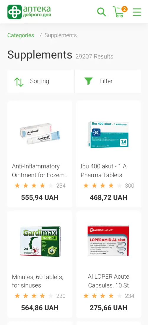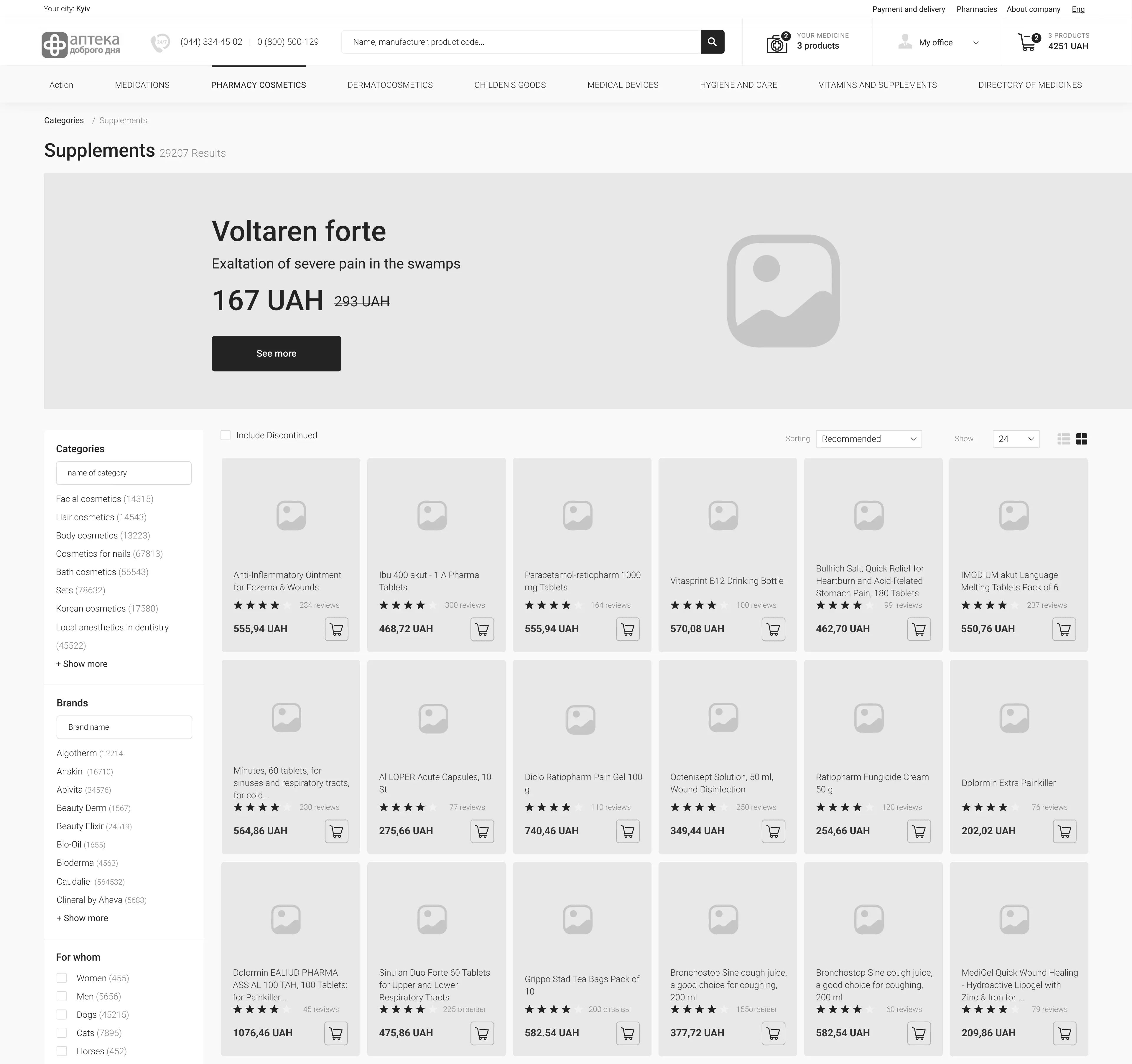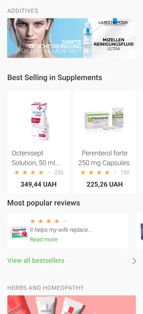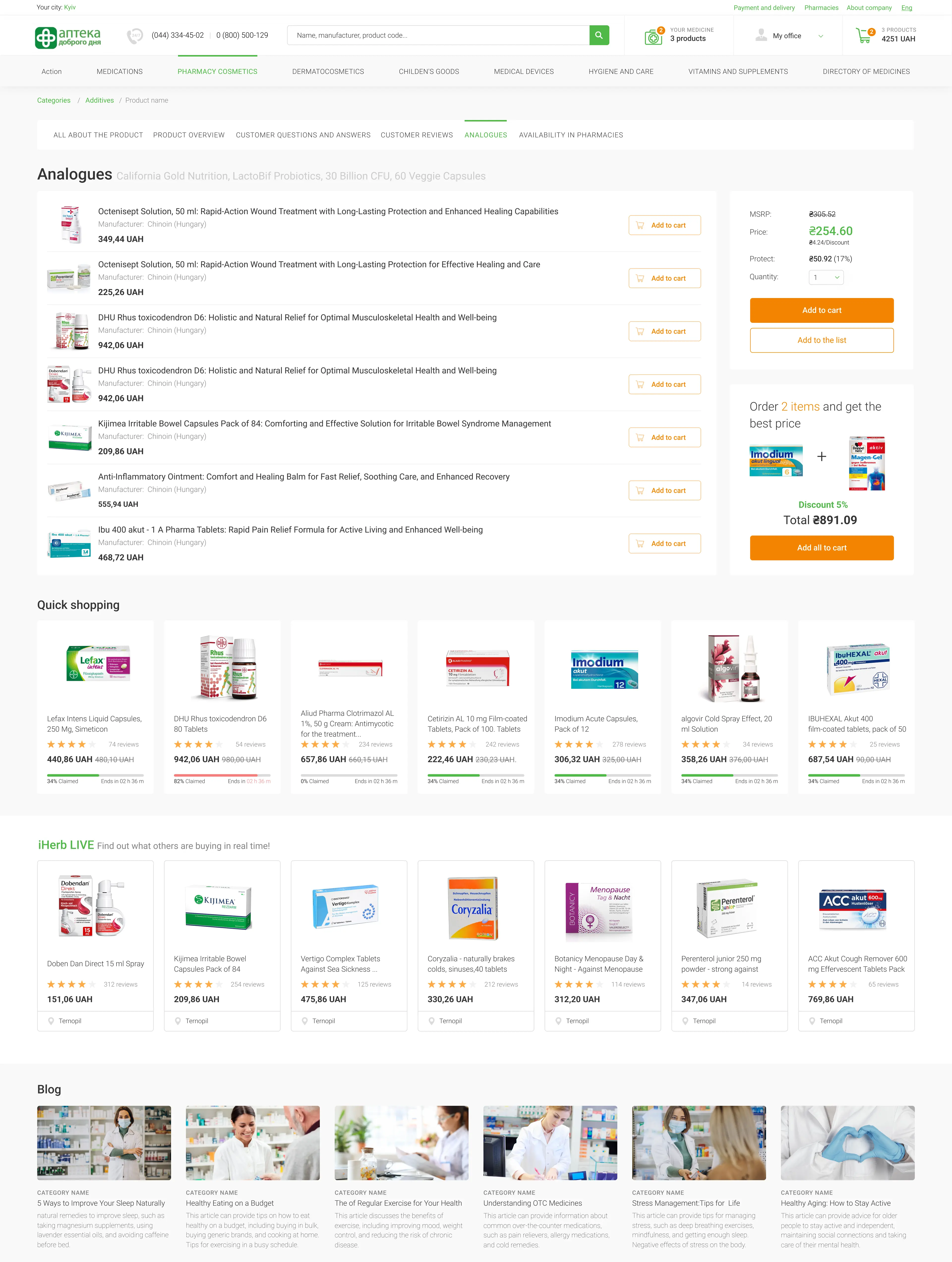 The product card provides detailed information about a specific item. It includes the product name, photos, description, usage instructions, ingredients, manufacturer, price, and other specifications. Through a slider, all this information can be conveniently viewed on a single page, ensuring even more convenient and quick access to all necessary product details.