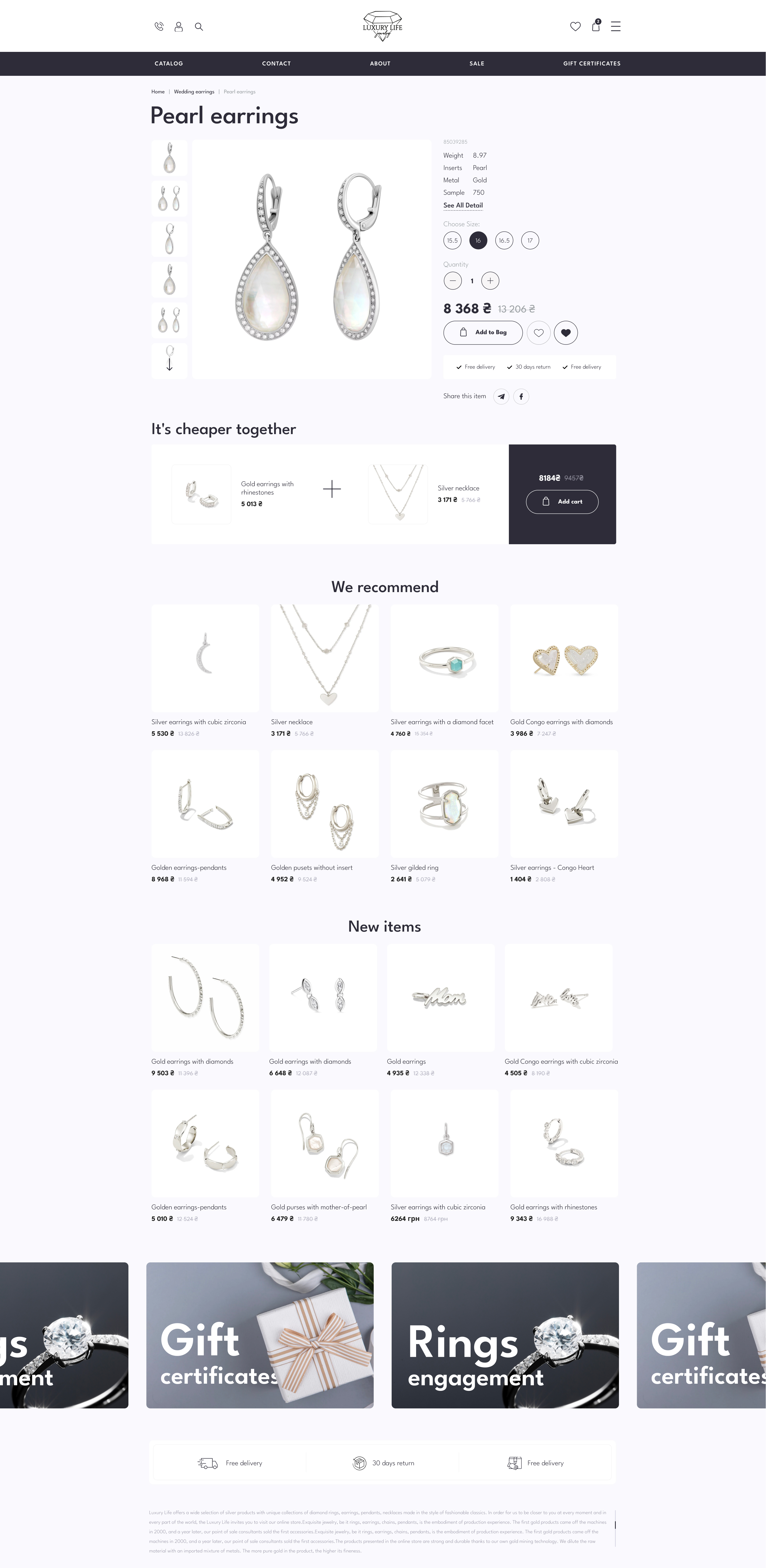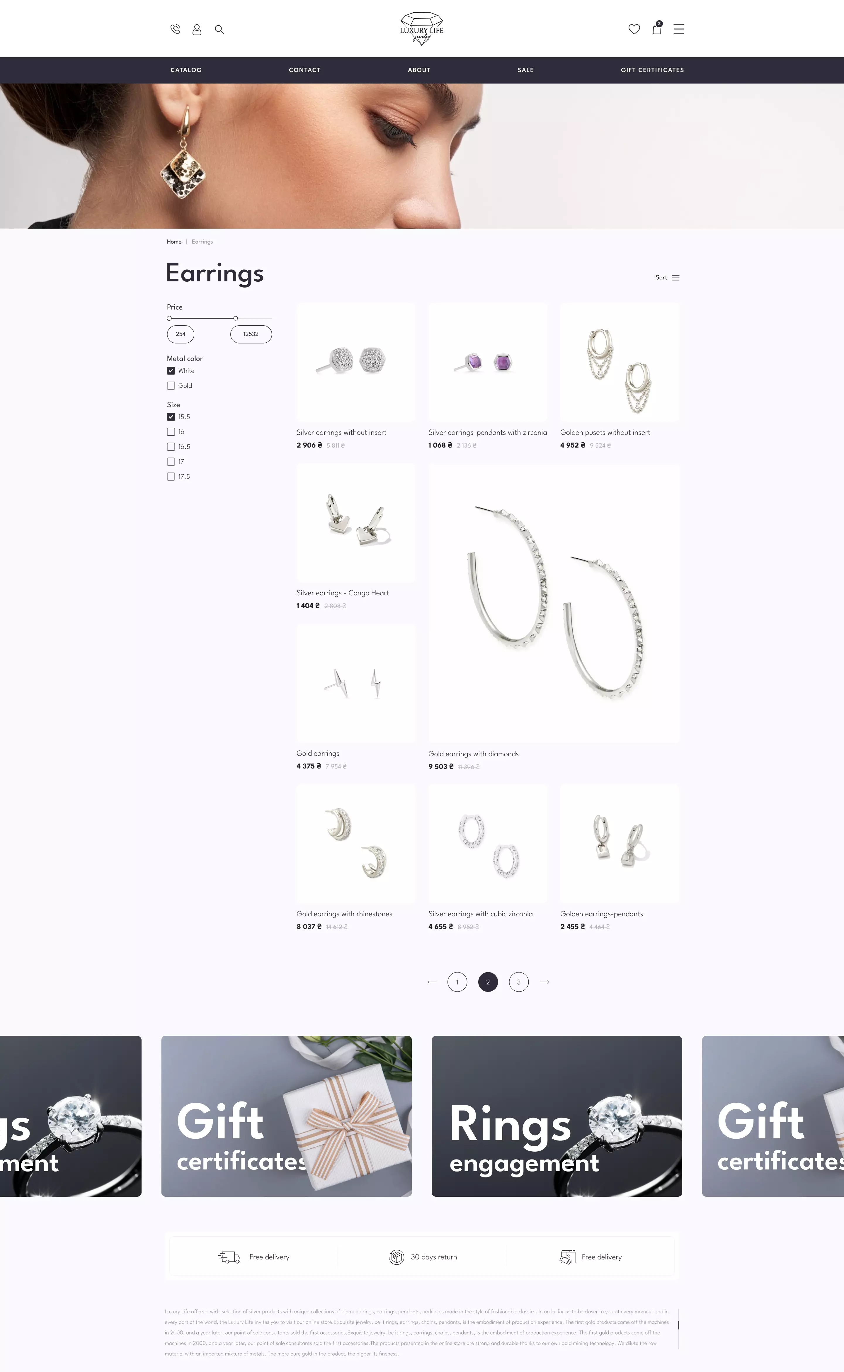 Домашня сторінка інтернет-магазину ювелірних виробів містить меню навігації для швидкого доступу до категорій товарів, банери з поточними пропозиціями, функцію пошуку для пошуку конкретних товарів, важливу контактну інформацію, можливості створення облікового запису або входу в систему, інформацію про способи доставки та оплати , а також посилання на соціальні мережі.