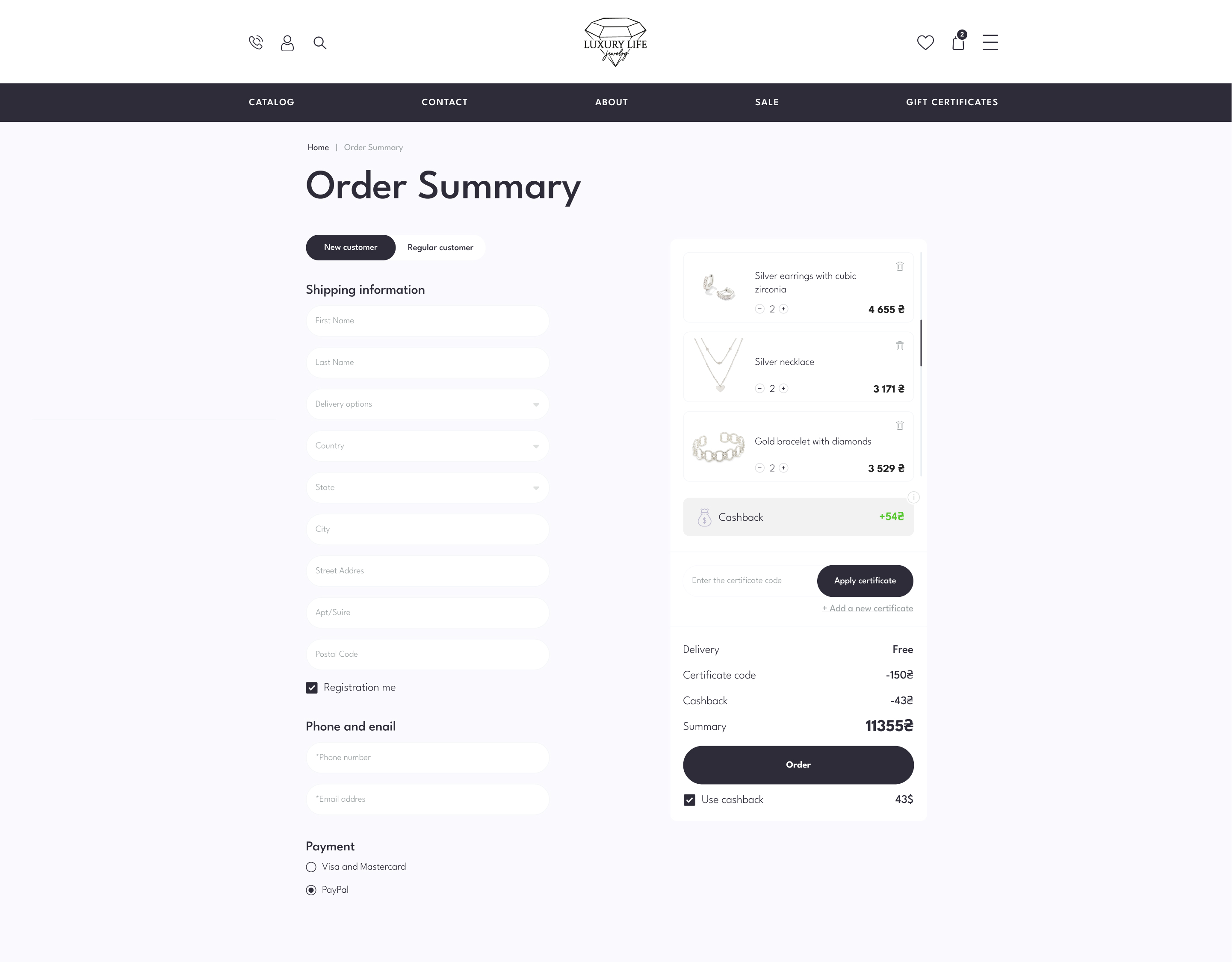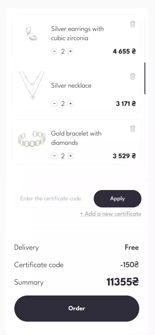 Сторінка замовлення надає інформацію про замовлення, інформацію про доставку та інші деталі, що допомагає переглянути замовлення перед його завершенням. Також тут можна вести промокод і побачити скільки буде нараховано кешбеку.