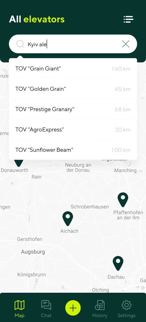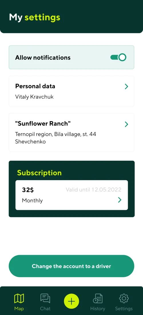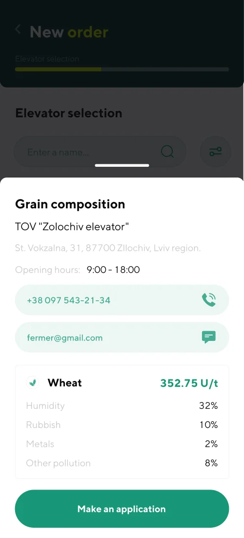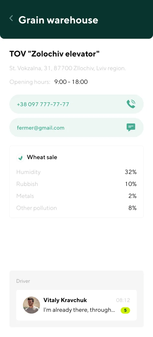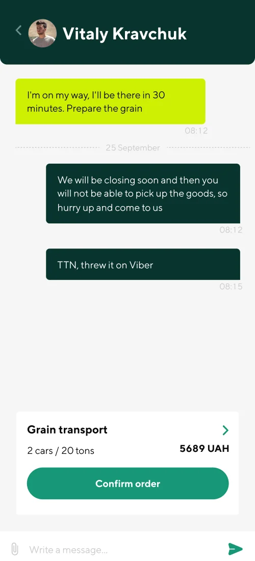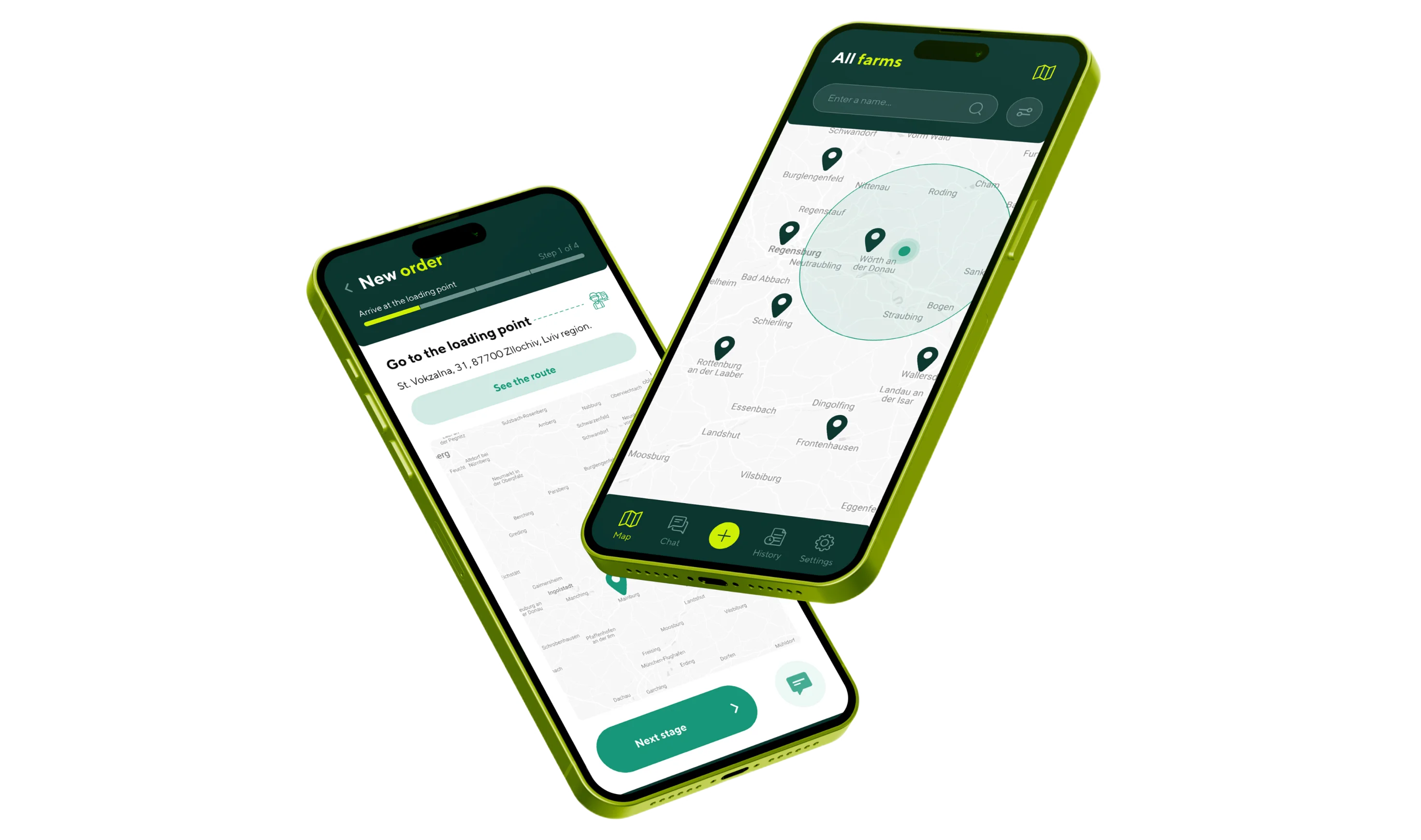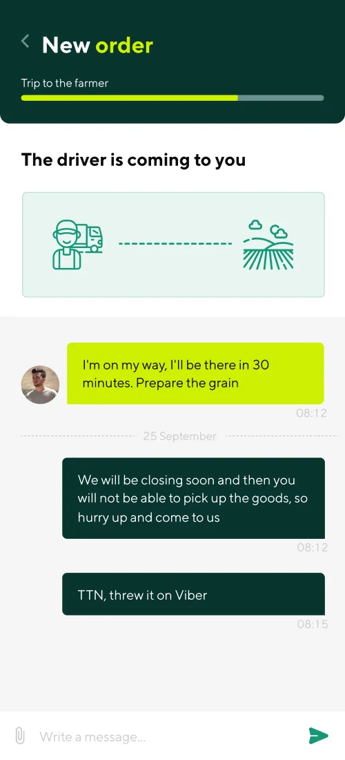 The farmer at any time can place an order. And after agreeing on all the details with the driver, see the online status of the order and the ability to correspond with the driver without leaving the application.
