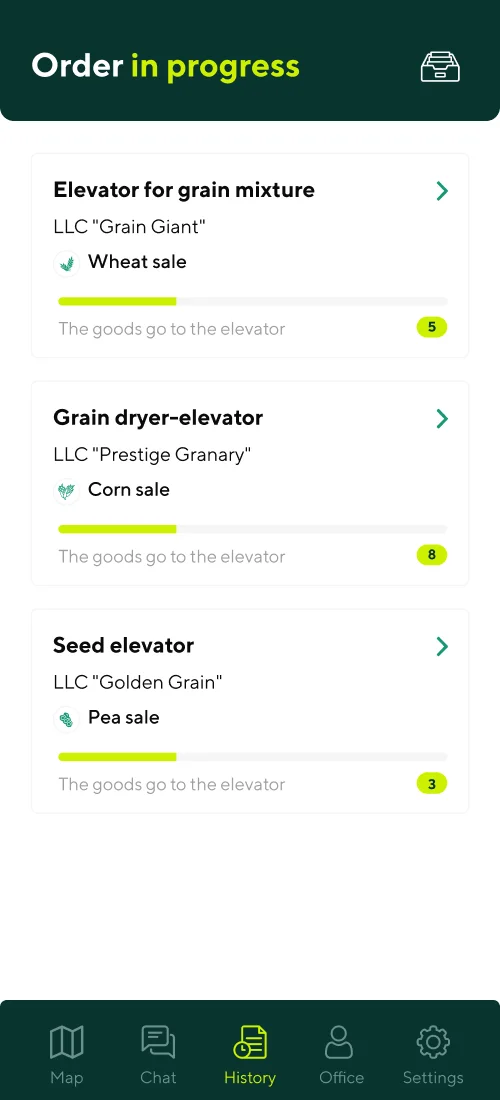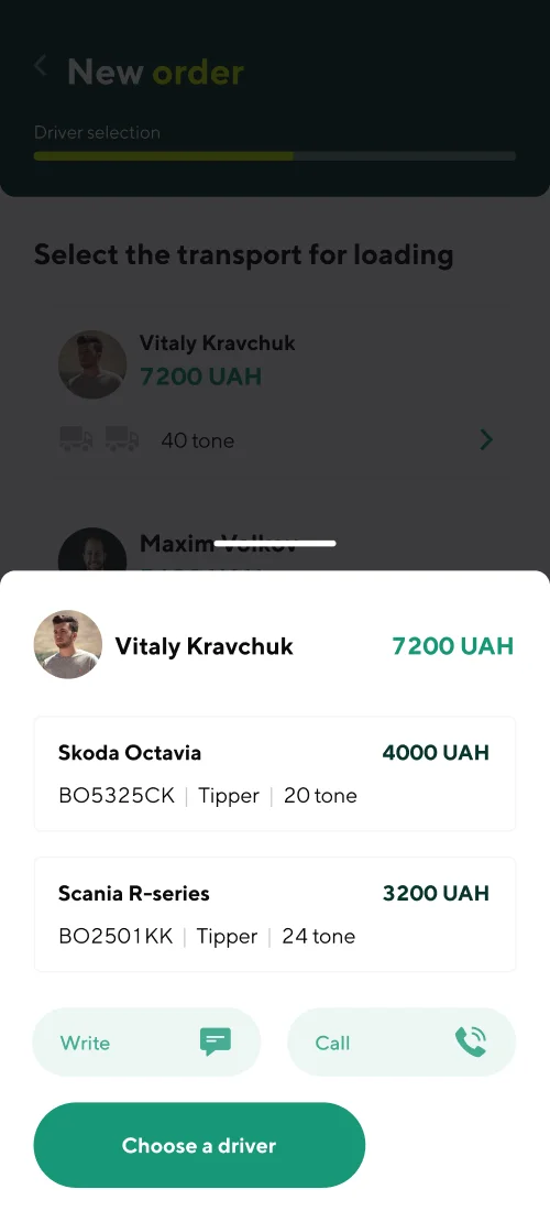 The driver has the opportunity to choose the order himself and put the price in accordance with his desires. He will also always see the status of the order and be able to correspond with the farmer