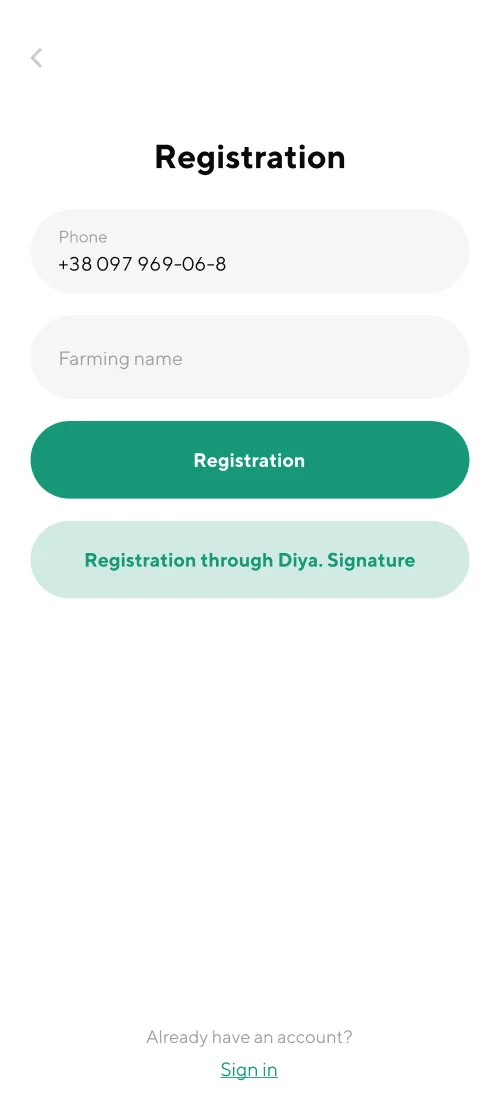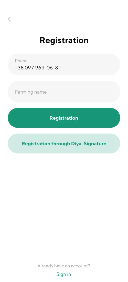 Registration takes place only by filling in 2 fields. Also, after registration, it is immediately proposed to fill in the farmer's data and choose a password.