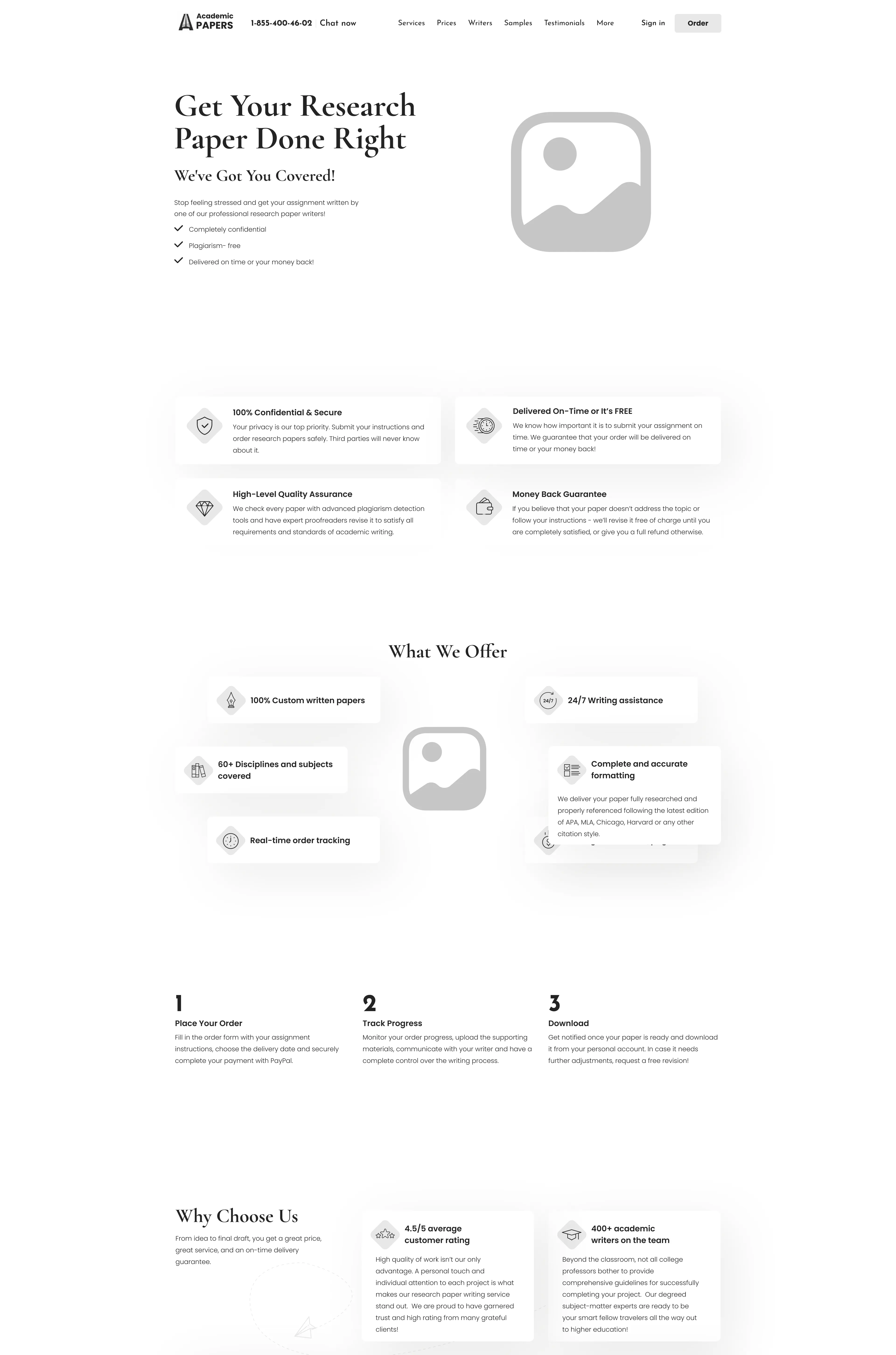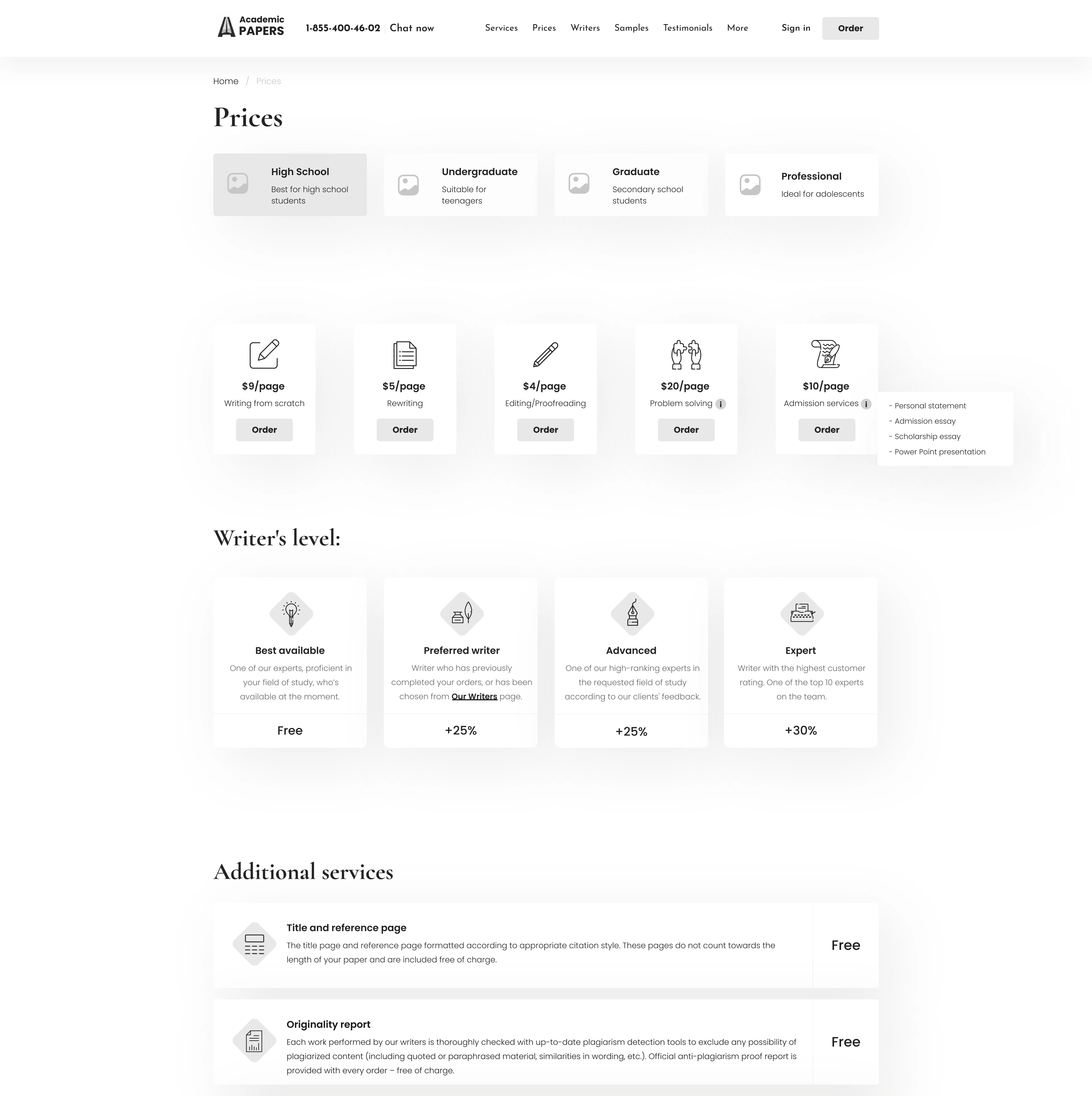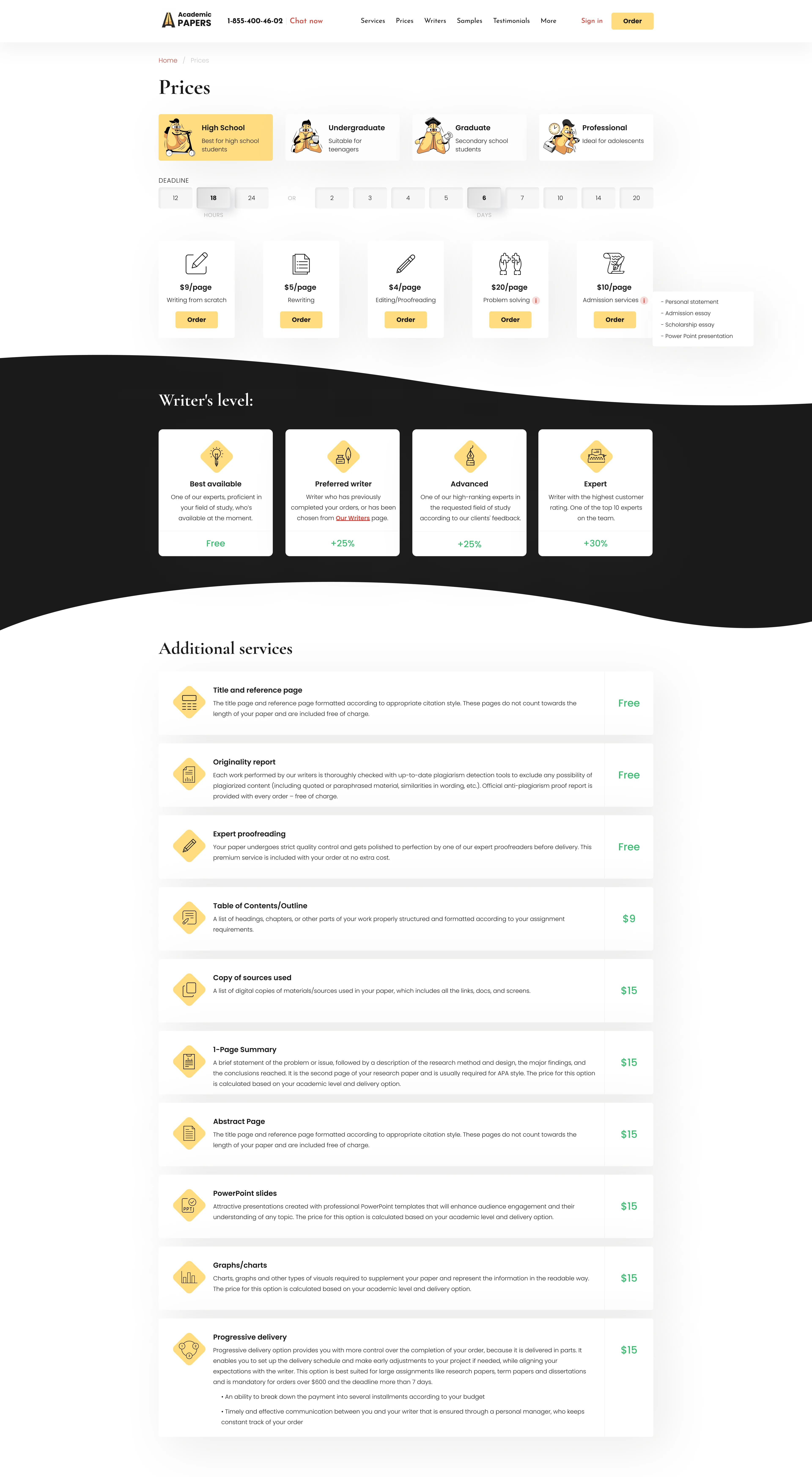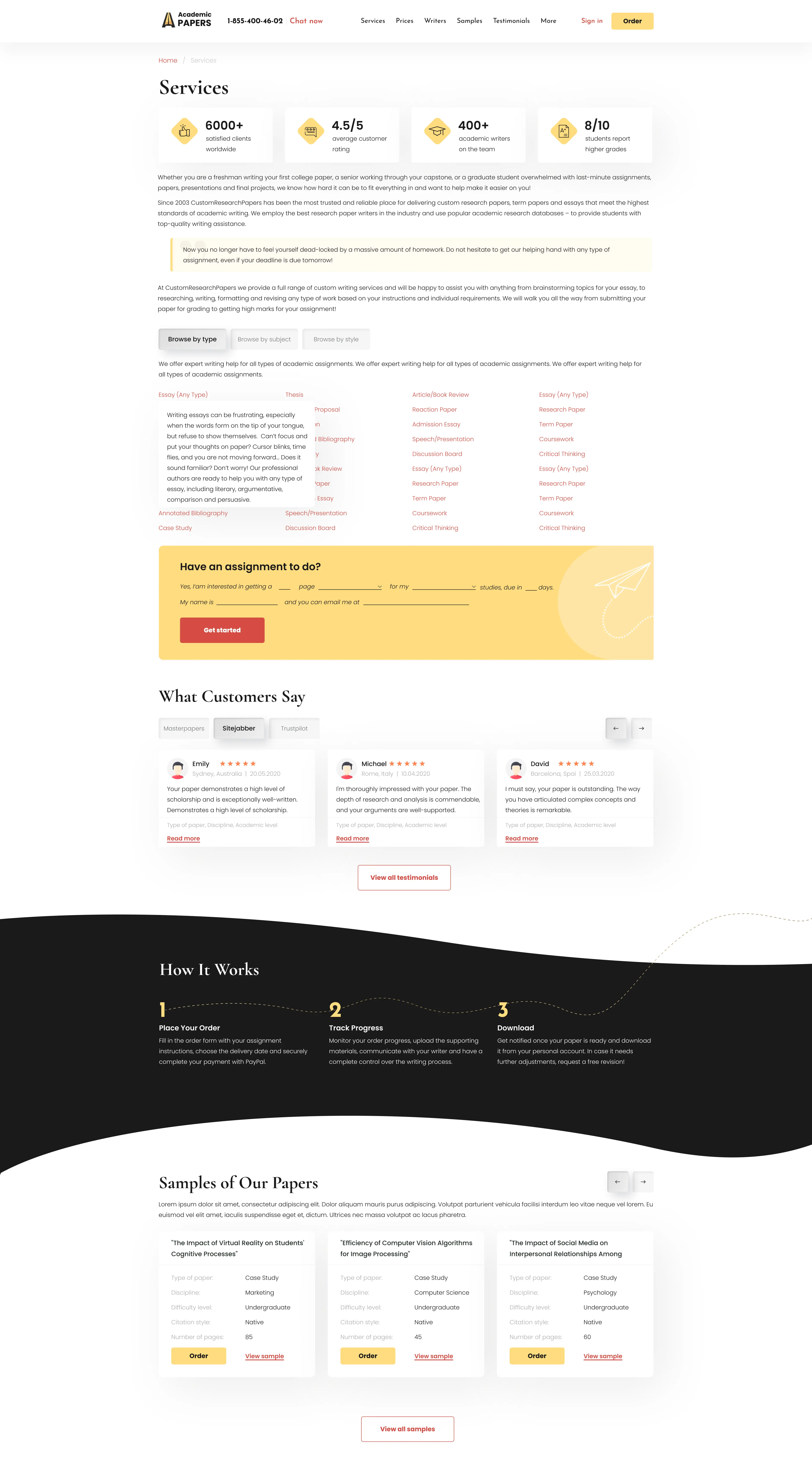 Convenient access to custom academic papers, showcasing information about key services, company benefits, client testimonials, and pricing plans.