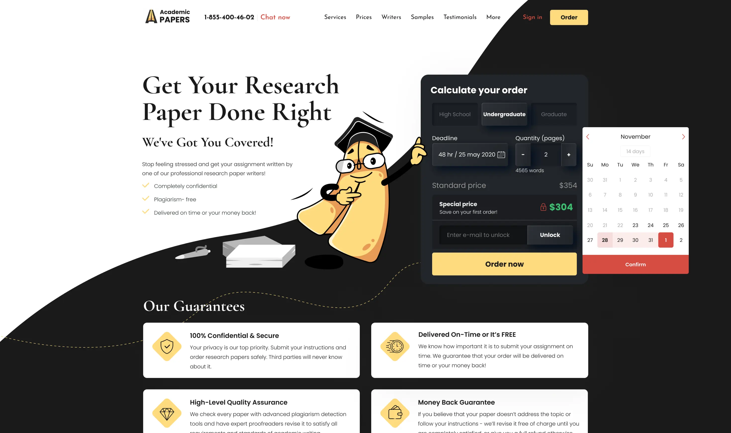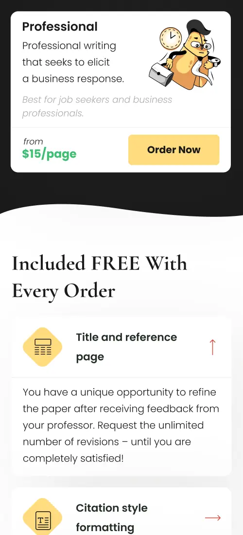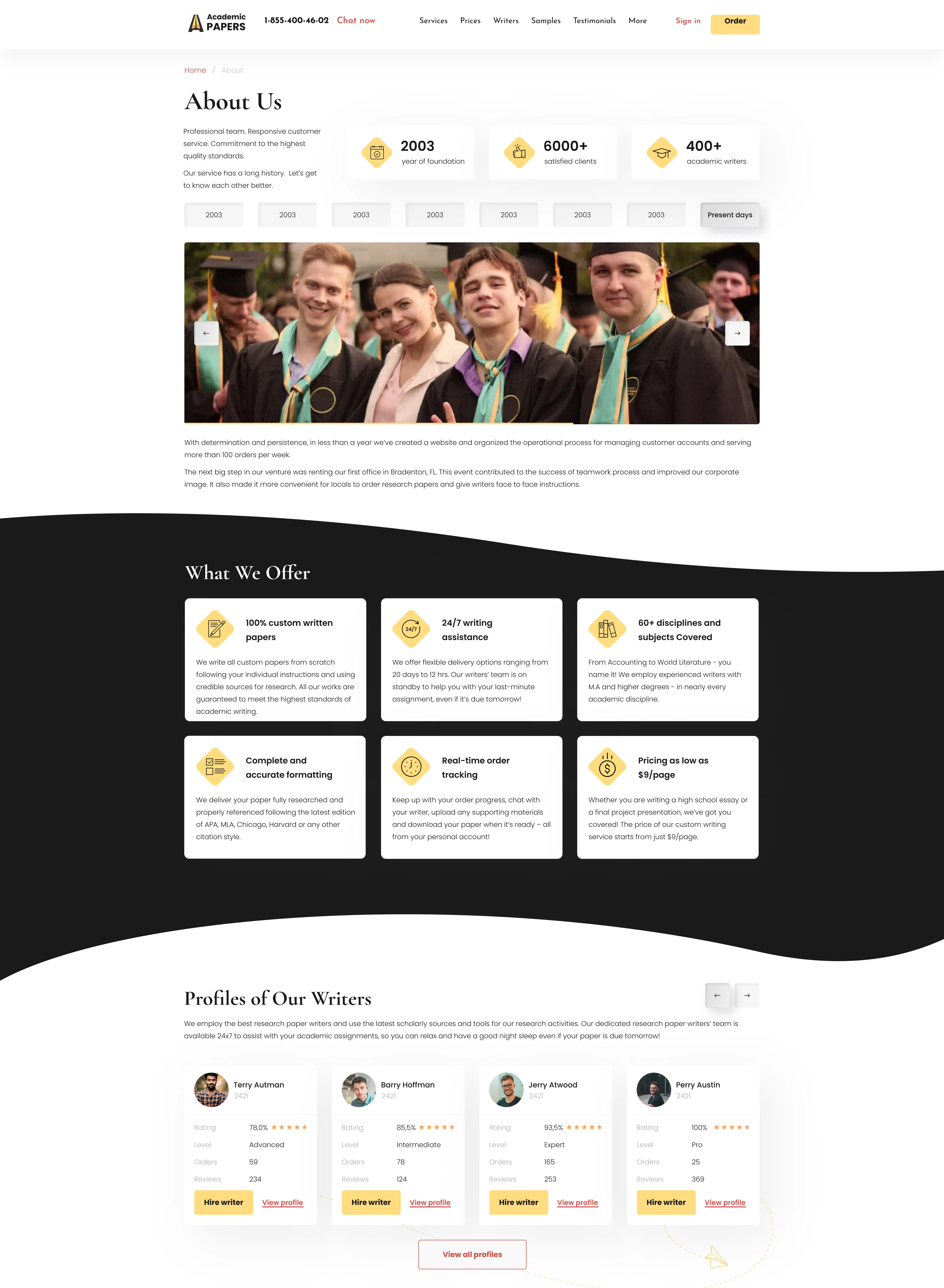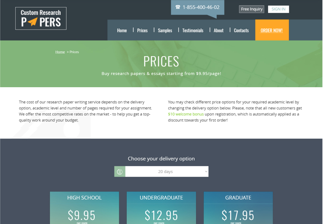 Convenient access to custom academic papers, showcasing information about key services, company benefits, client testimonials, and pricing plans.
