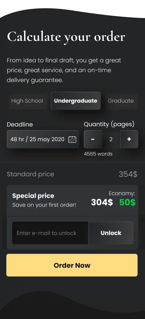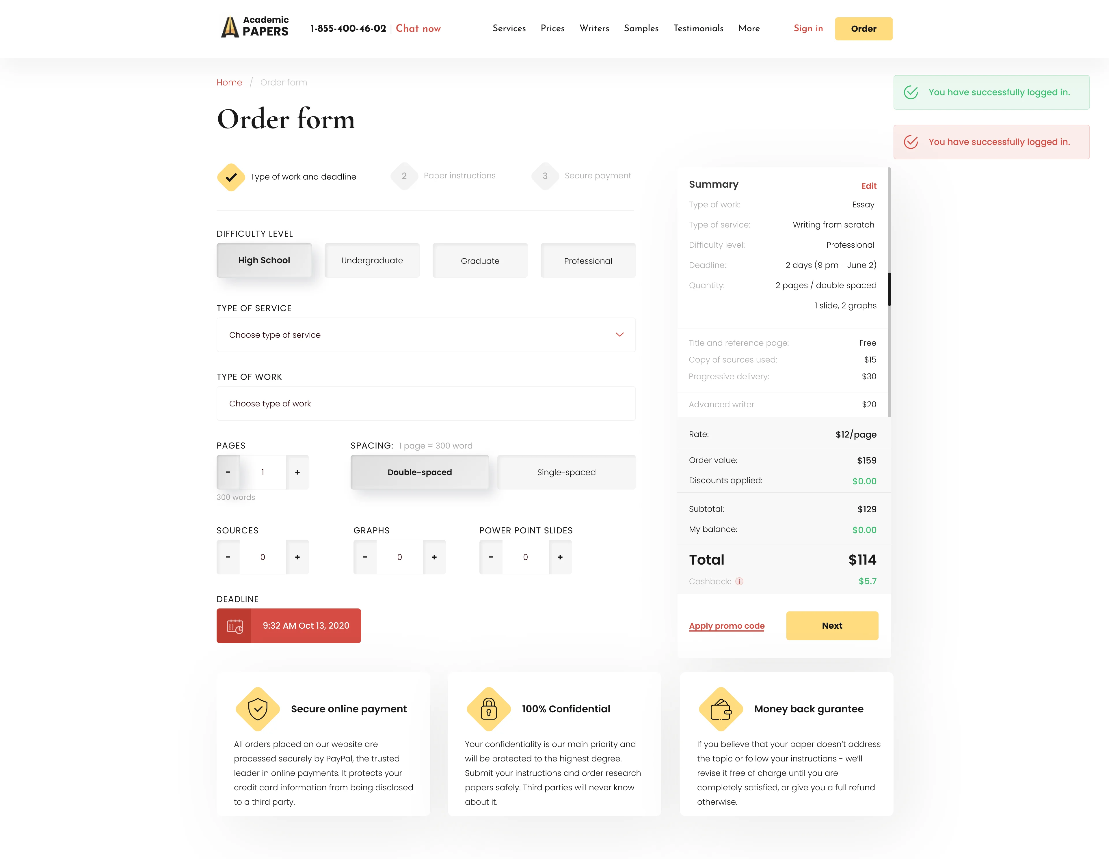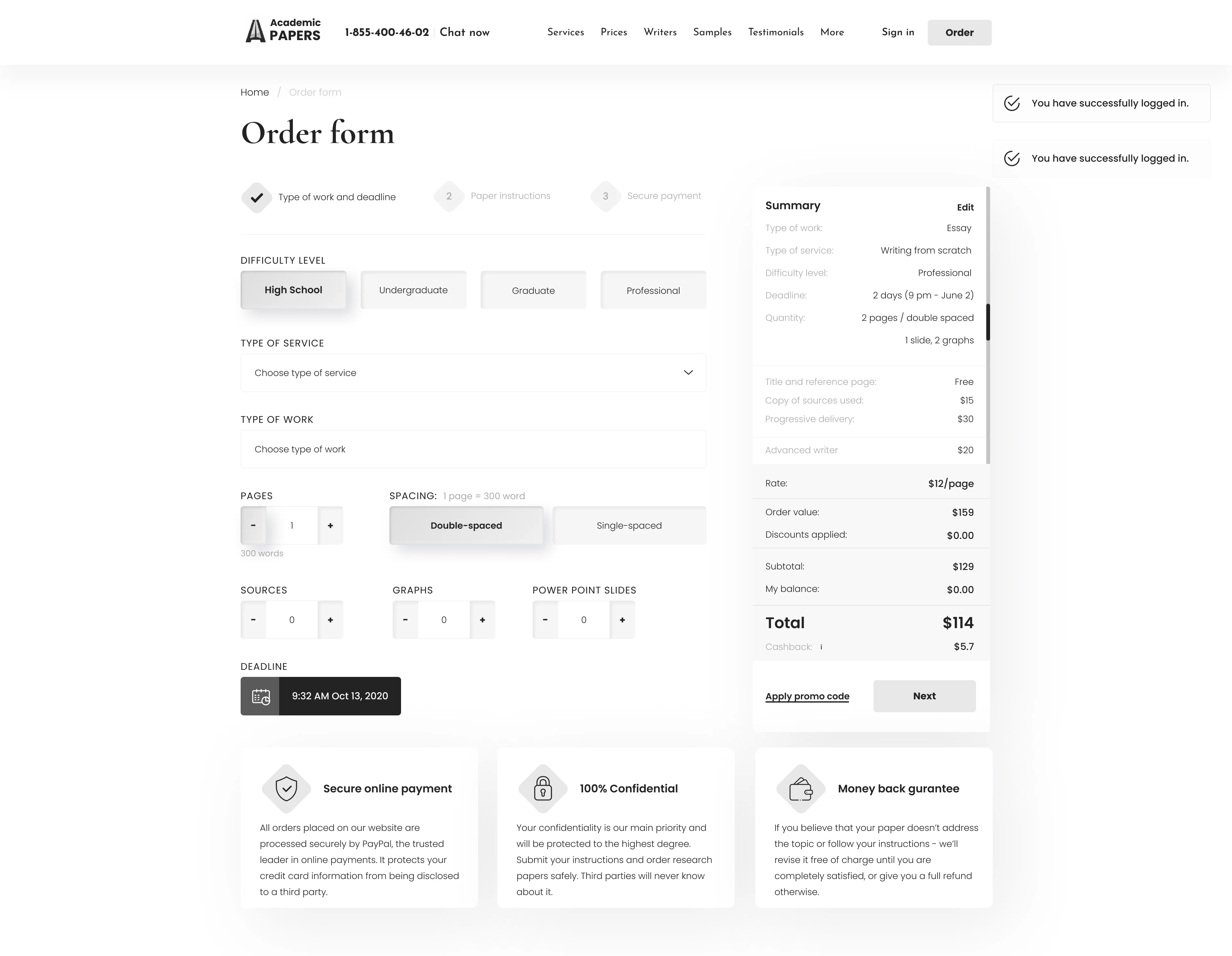 A developed order form provides detailed information about any ordered academic work and its cost, allowing users to immediately see what they are paying for.
