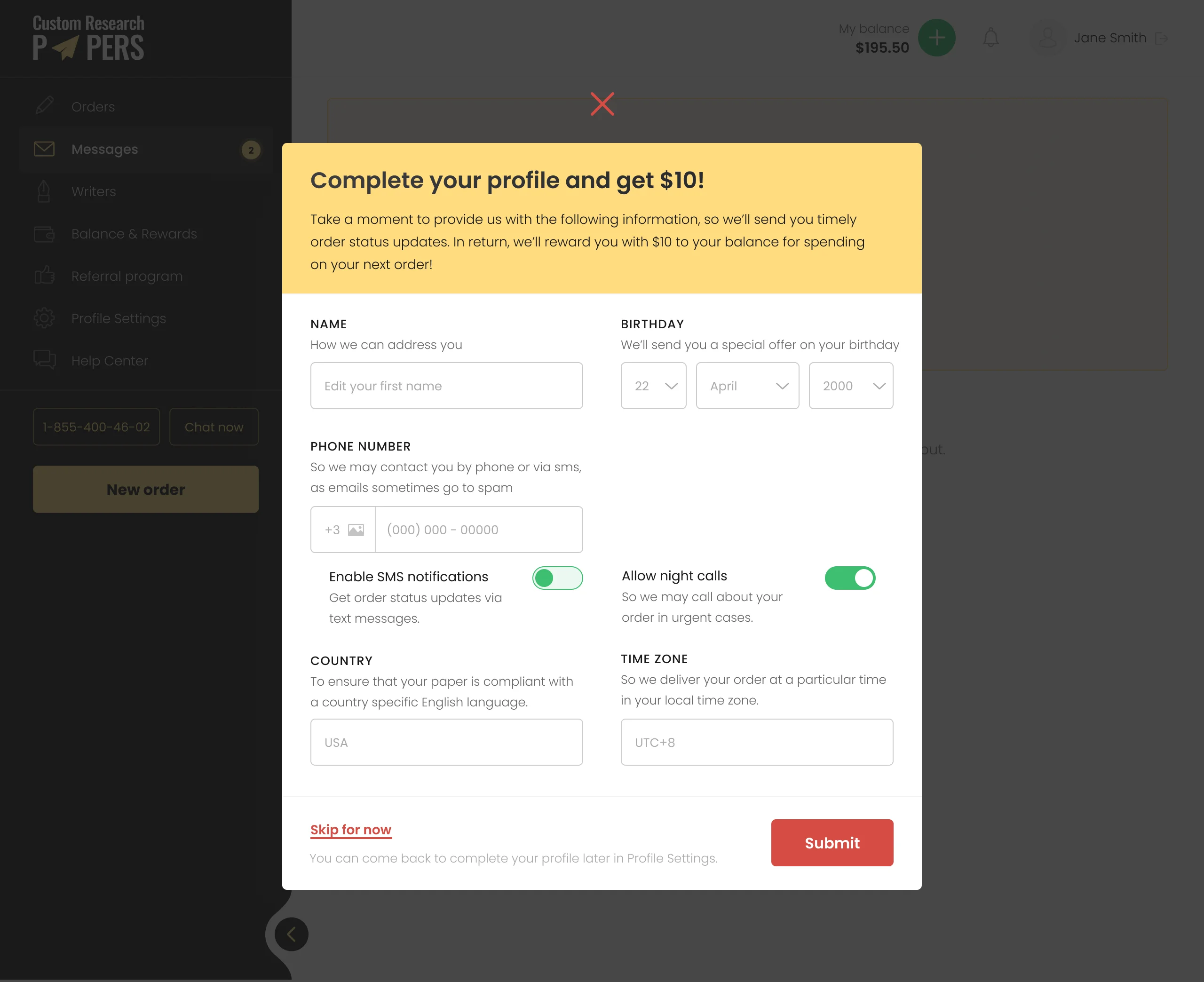 contains a form where you can specify all necessary order details, such as paper type, discipline, complexity level, citation style, and page count.