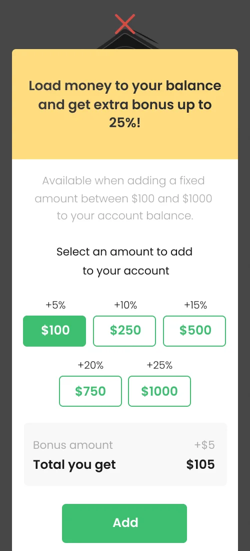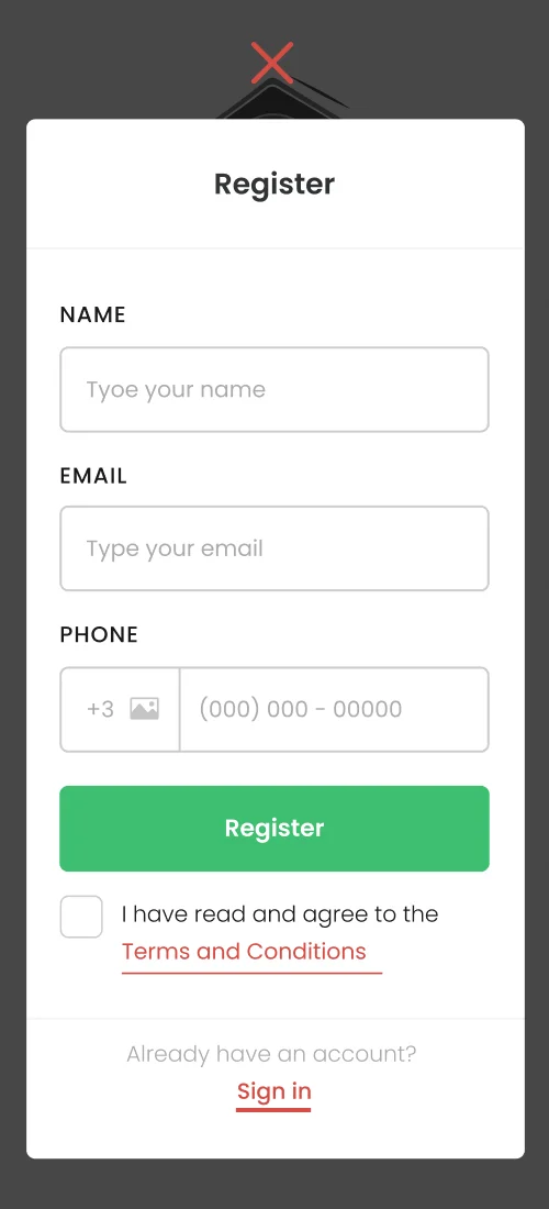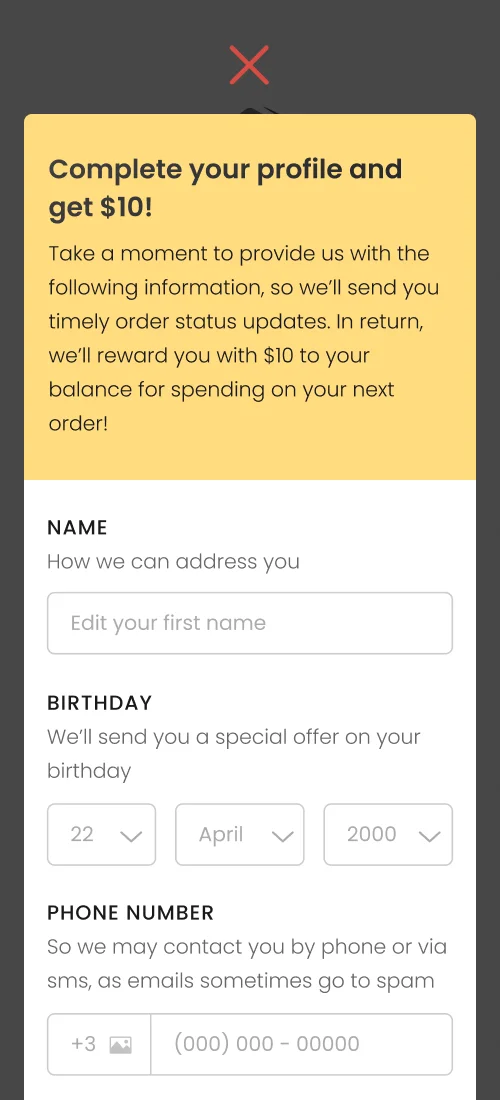 Includes registration options, order checkout, summarized order and invoice information, the ability to top up balance with bonus options, as well as profile completion for additional benefits.