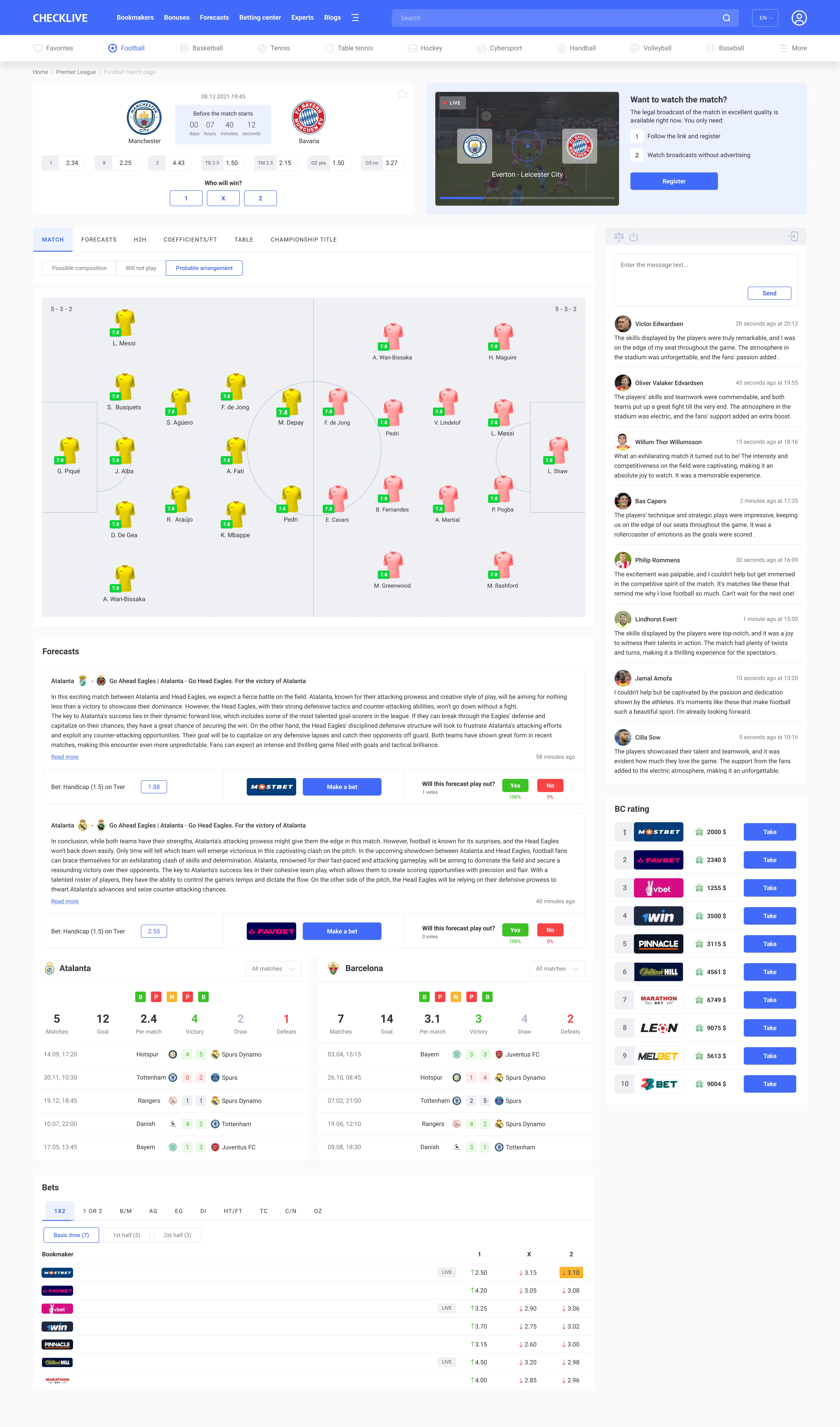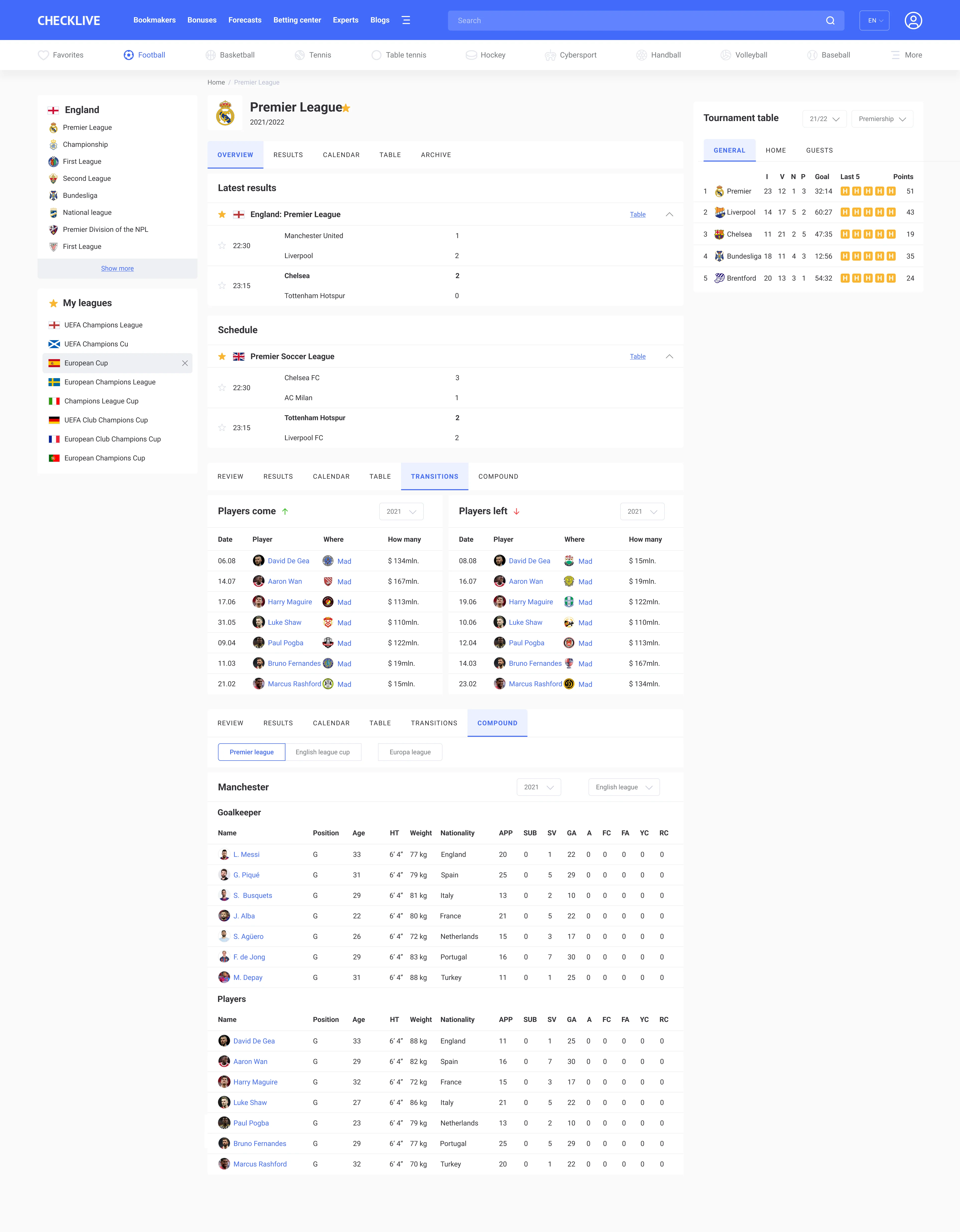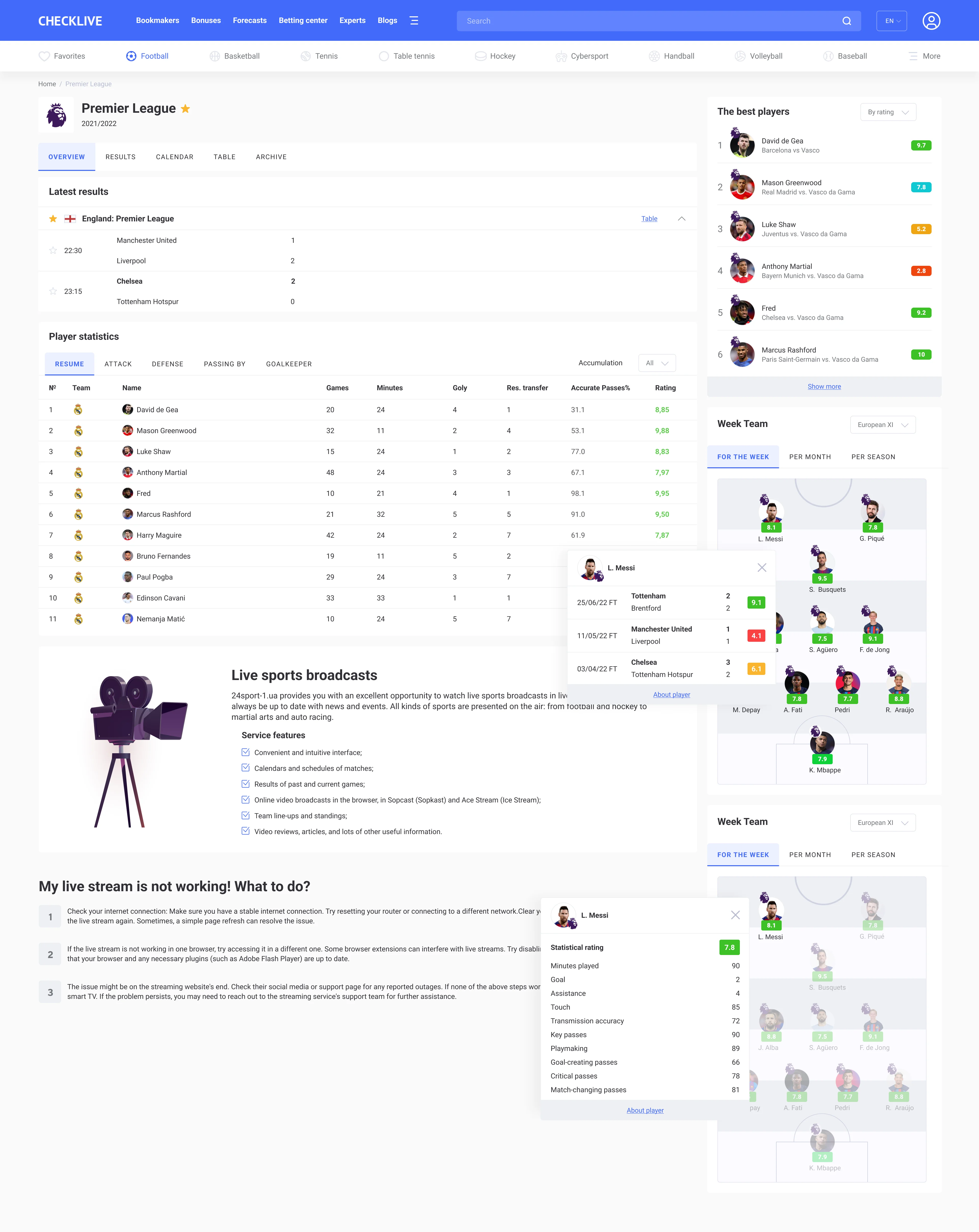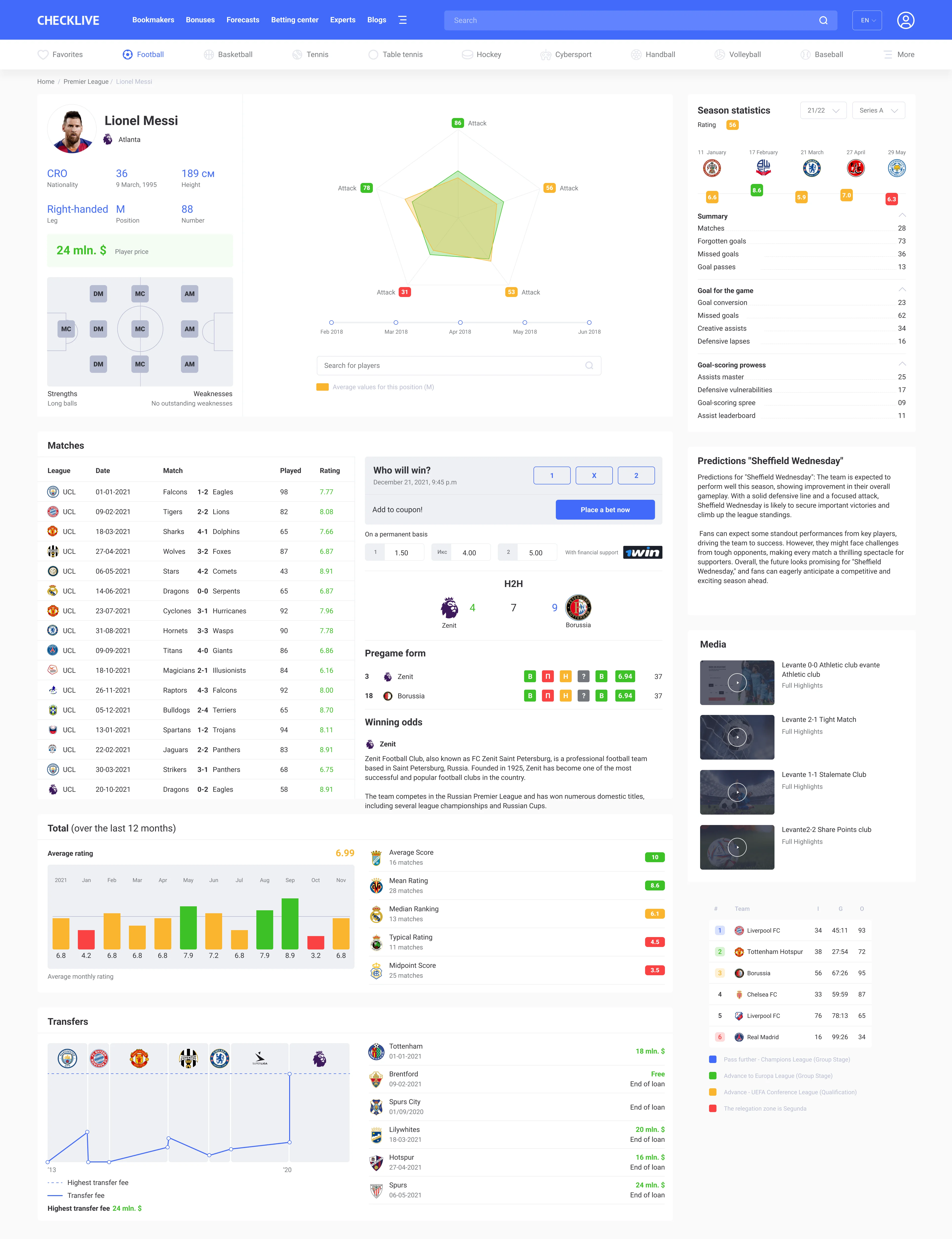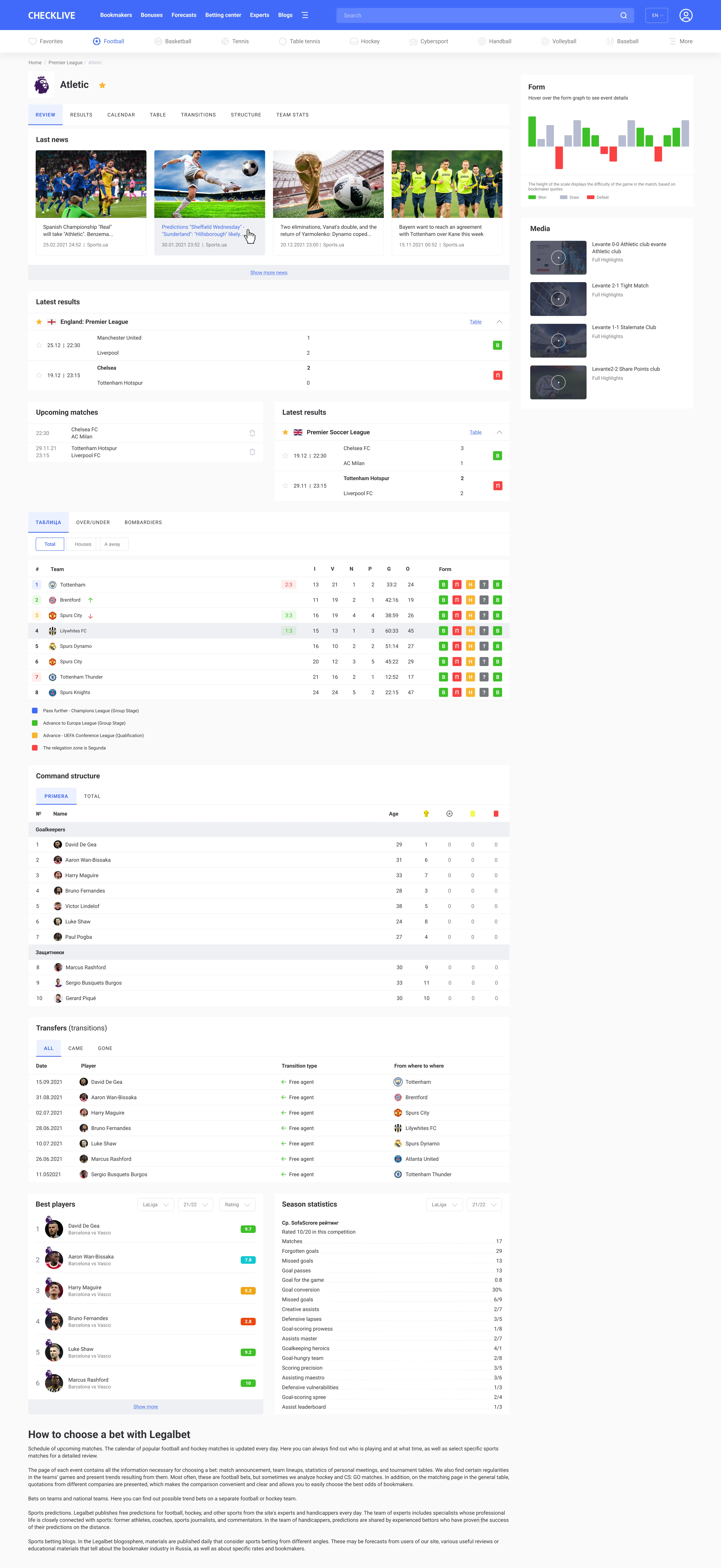 Team page, player page, hredictions and sports betting