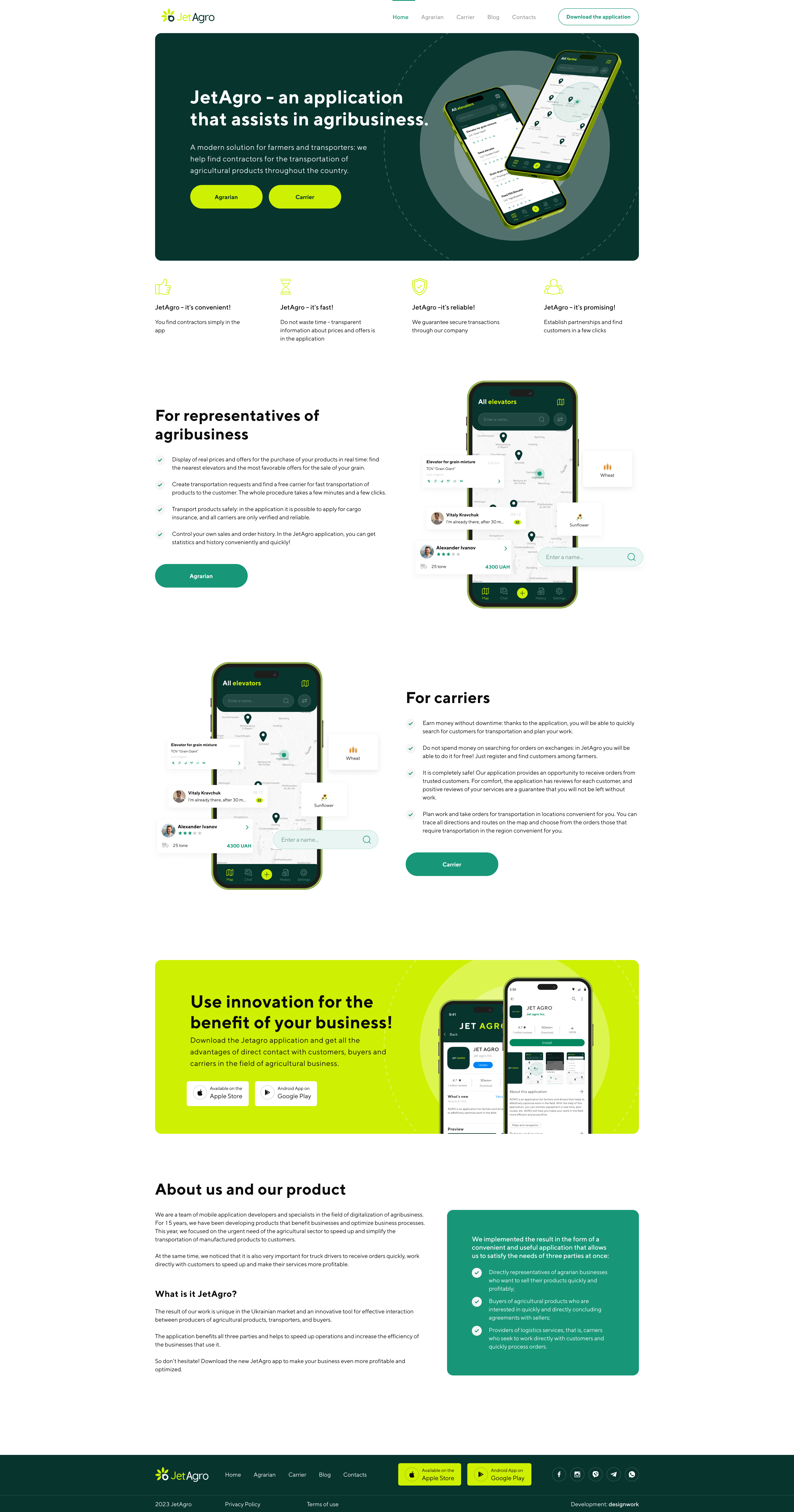 Інноваційний агропромисловий стартап, що об'єднує фермерів і водіїв через зручний мобільний додаток. Дизайн має просту та зрозумілу структуру, адаптовану під кожну цільову аудиторію. Окремі посадкові сторінки для фермерів і водіїв допомагають їм швидко знайти переваги використання платформи. Також доступний блог із корисною інформацією для підвищення залученості користувачів.