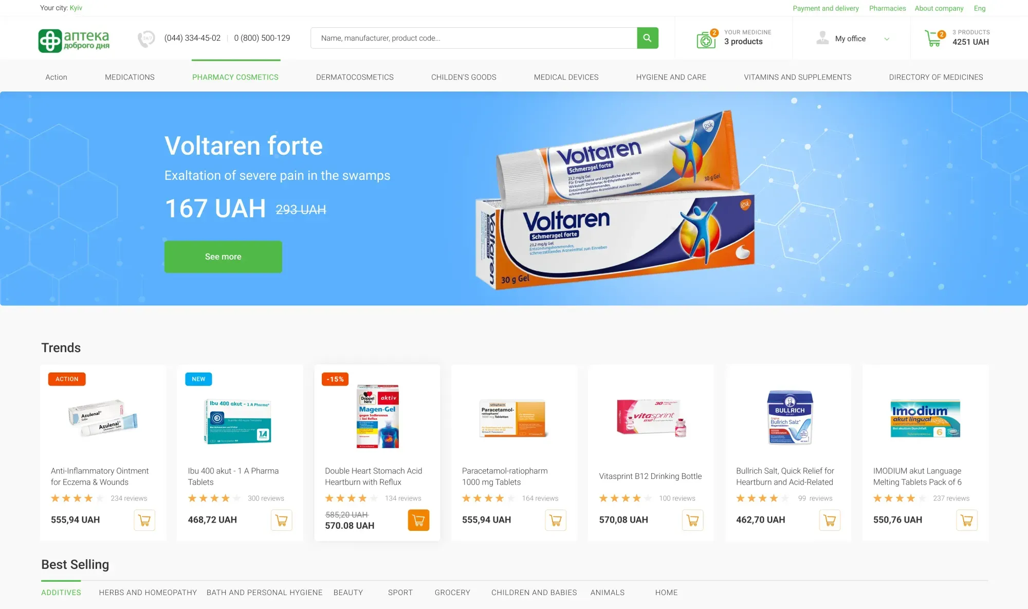 Широкий вибір фармацевтичної продукції та медичних засобів.