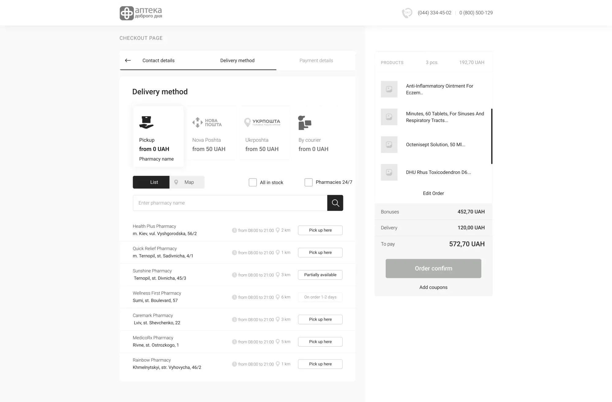 Процес замовлення був оновлений на кілька етапів: додано можливість вибору конкретної аптеки, змінено картку товару та додано перемикачі зверху для зручного доступу до ключової інформації на одному екрані.